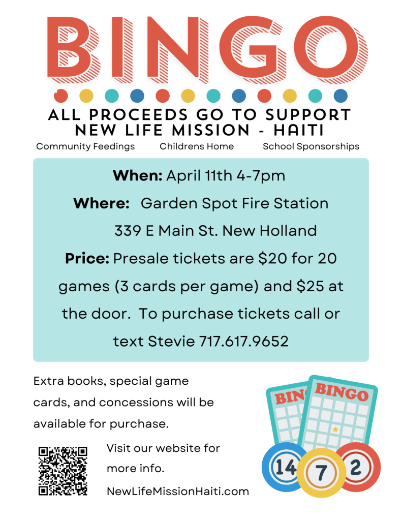 New Life Mission – Haiti, Inc. wants to invite you to our 2nd annual Bingo Fundraiser on April 11, 2026 at 4-7pm at New Holland Fire Rescue (339 E Main Street, New Holland, PA).